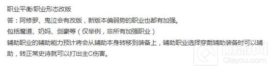 策划回答:阿修罗、鬼泣会有改版,新版本偏弱势的职业也都有加强。包括魔道、奶妈、剑豪等(仅举例,非所有加强职业)。辅助职业的辅助能力预计将会从辅助本身转移到装备上,辅助职业选择穿献辅助装备时可以辅助,转正常史诗就可以打出主C伤害。