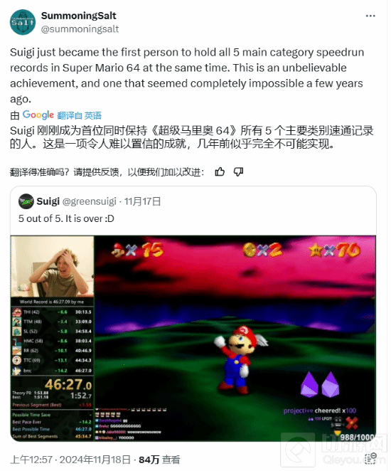 在速通界,Suigi的名字已经成为一个传奇。他不仅横扫了《超级马里奥64》所有类别的纪录,最近更是完成了一项令人难以置信的壮举——一举夺得五项主要速通纪录,这一成就被誉为“速通史上最伟大的成就之一”。