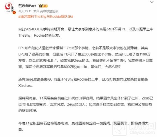 据微博博主报道,LPL知名经纪人涵艺在微博评价了这件事,认为自己要是Zeus的话,肯定也不会留在T1,因为自己得不到尊重。