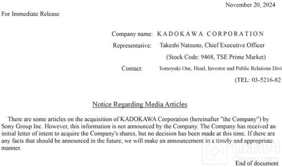 角川集团承认已收到索尼集团关于收购股份的初步意向书,但目前尚未做出任何最终决定。公司承诺,一旦有任何需要公开的具体事项,将及时发布正式公告。