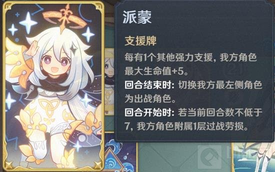 派蒙支援牌:固定存在,提供额外生命值并切换出战角色,回合数≥7时附加过战劳损(削弱生命值)。
