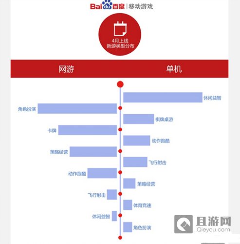 4月份,百度移动游戏新上线游戏产品144款,其中网游90款,单机54款。从上线游戏产品类型的构成来看,本月上线新游类型更加多样化,但网游上线新游中RPG类和卡牌类上线新游仍占据近7成;单机上线新游中则是以上手简单且操作门槛低的休闲益智类游戏为主,占据单机上线新游的近5成之多。