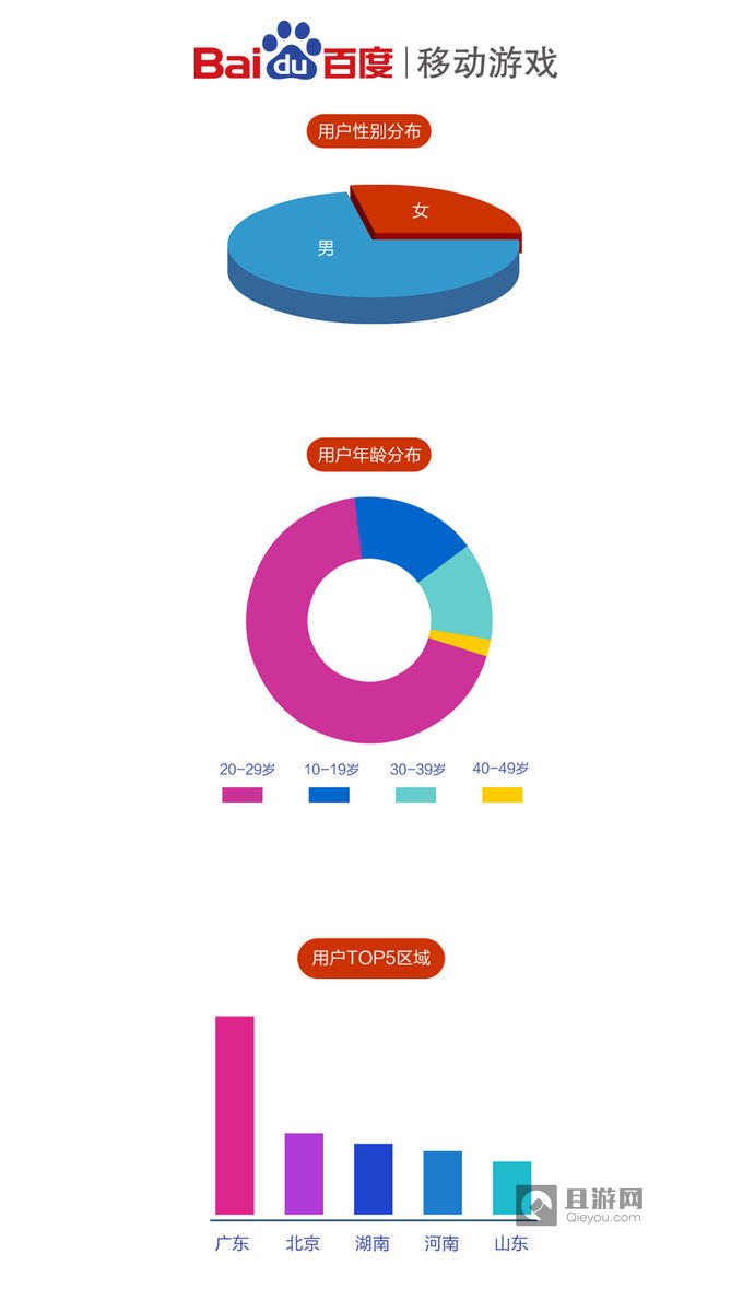 报告还展示了4月份平台用户的一些特征,数据显示,平台用户男女比例基本为7:3,女性用户潜力巨大,且已经展示出强大的活力,4月份新上线的《范冰冰:模范学院》成功跻身留存TOP10榜和玩家关注TOP10榜,与女性玩家不无关系。用户年龄方面,20岁-29岁仍为玩家主力人群。用户地域方面,广东、北京、湖南、河南、山东位居用户数量前五位。