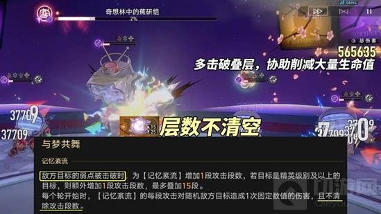 针对敌方弱点属性编排队伍,并利用【记忆紊流】机制,在较低的回合数内快速叠层提升输出。中低配玩家也可以通过叠层积累显著降低满星难度。
