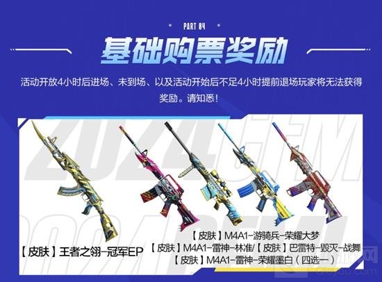 本次总决赛线下观赛活动的基础购票奖励为王者之翎-冠军EP皮肤与M4A1-游骑兵-荣耀大梦、M4A1-雷神-林准、巴雷特-毁灭-战舞和M4A1-雷神-荣耀墨白皮肤四选一自选卡。