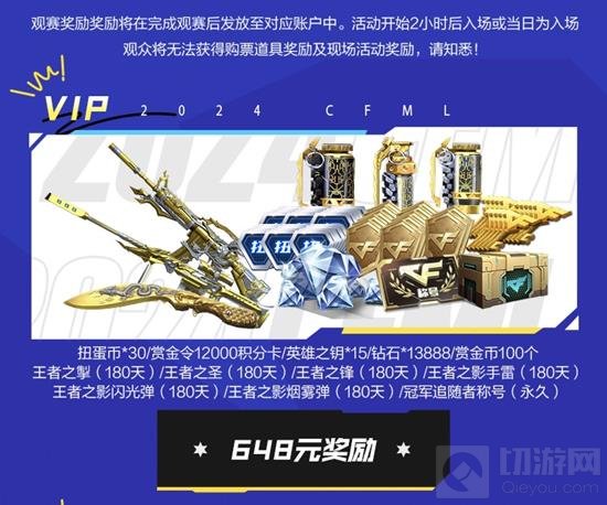 对于进阶购票奖励而言,购买648元VIP门票的CFer将获得扭蛋币×30、赏金令12000积分卡、英雄之钥×15、钻石×13888、赏金币100个、王者之圣(180天)、王者之掣(180天)、王者之锋(180天)、王者之影手雷(180天)、王者之影闪光弹(180天)、王者之影烟雾弹(180天)和冠军追随者称号。