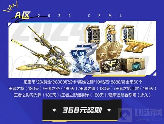 购买368元A区门票的CFer将获得扭蛋币×20、赏金令8000积分卡、英雄之钥×10、钻石×8888、赏金币60个、王者之掣(180天)、王者之圣(180天)、王者之锋(180天)、王者之影手雷(180天)、王者之影闪光弹(180天)、王者之影烟雾弹(180天)和冠军追随者称号。