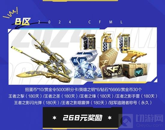 购买268元B区门票的CFer将获得扭蛋币×10、赏金令5000积分卡、英雄之钥×6、钻石×6666、赏金币30个、王者之掣(180天)、王者之圣(180天)、王者之锋(180天)、王者之影手雷(180天)、王者之影闪光弹(180天)、王者之影烟雾弹(180天)和冠军追随者称号。