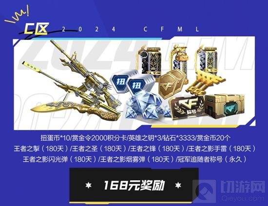 购买168元C区门票的CFer将获得扭蛋币×10、赏金令2000积分卡、英雄之钥×3、钻石×3333、赏金币20个、王者之圣(180天)、王者之掣(180天)、王者之锋(180天)、王者之影手雷(180天)、王者之影闪光弹(180天)、王者之影烟雾弹(180天)和冠军追随者称号。