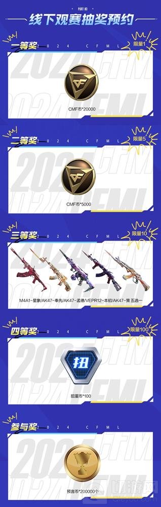 凡是购票的CFer皆可以在现场参与线下抽奖活动,每位购票用户只能预约一档奖励。我们将在比赛现场的场间互动环节从预约池中抽取中奖玩家。一等奖将抽取一位幸运观众送出20000CFM币,二等奖将抽取5位幸运观众送出5000CFM币,三等奖将抽取10位幸运观众送出武器自选卡(M4A1-星象、AK47-奉先、AK47孟德、VEPR12-本初和AK47-策五选一),四等奖将抽取100位幸运观众送出100扭蛋币。所有参与抽奖的CFer都可以获得200000预言币的参与奖励。