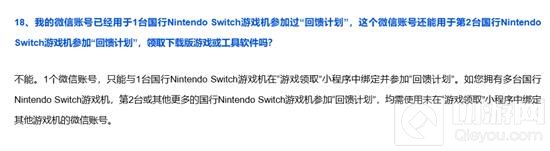 1个微信账号,只能与1台国行Nintendo Switch游戏机在“游戏领取”小程序中绑定并参加“回馈计划”。如您拥有多台国行Nintendo Switch游戏机,第2台或其他更多的国行Nintendo Switch游戏机参加“回馈计划”,均需使用未在“游戏领取”小程序中绑定其他游戏机的微信账号。