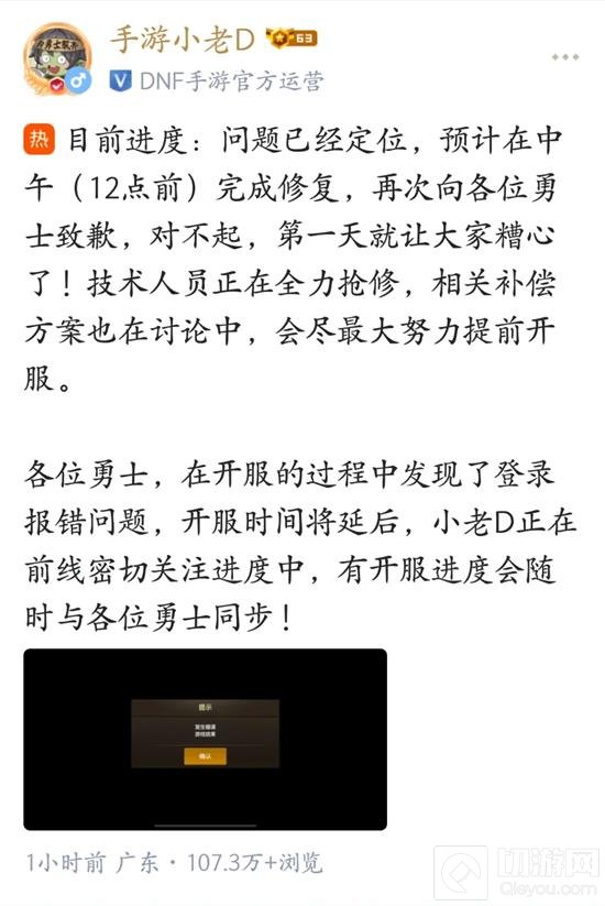 针对突发状况,DNF手游官方外团代表“阿乐”在社交平台上发布公告,表示技术团队已经迅速行动,开始进行全力修复。具体公告内容如下: