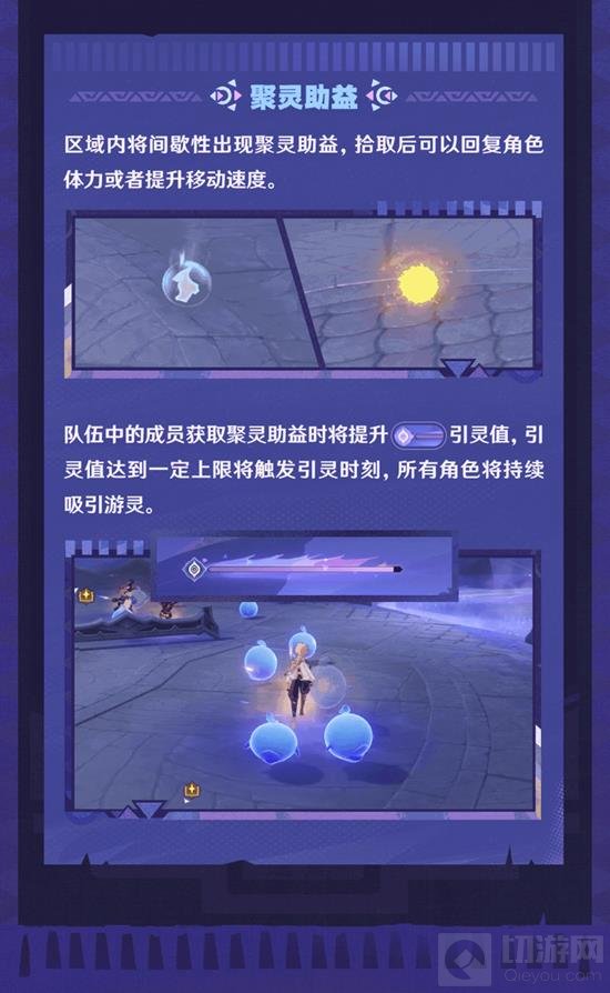 聚灵助益:场景中会周期性出现,拾取后可获得体力恢复或移动速度提升的增益。队伍成员获取此效果还能提高“引灵值”,当值满时触发“引灵时刻”,使角色在短时间内更高效吸引游灵。