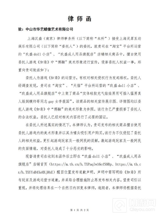 我们可以从如鸢发布的律师函中看见,官方表示“某成人用品旗舰店”中上架了商品“实体硅胶充气娃娃男用可插入猛男真人版倒模帅哥同志gay女李报国”,该商品的相关宣传展示图、详情图均以委托人游戏《如鸢》中“傅融”的美术形象为参照。该行为已严重损害了委托人的合法权益。委托人已经对相关内容进行了必要的固证。