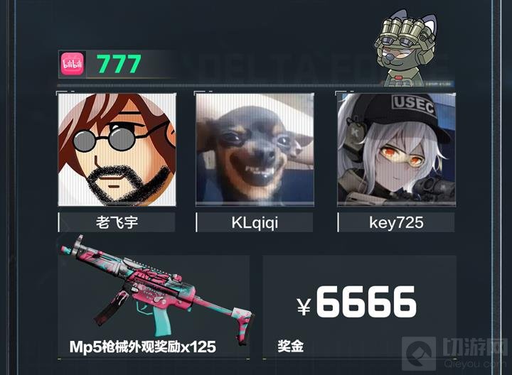 队员为老飞宇、KLqiqi、key725,获得MP5枪械外观奖励 * 125,以及6666人民币的奖金。