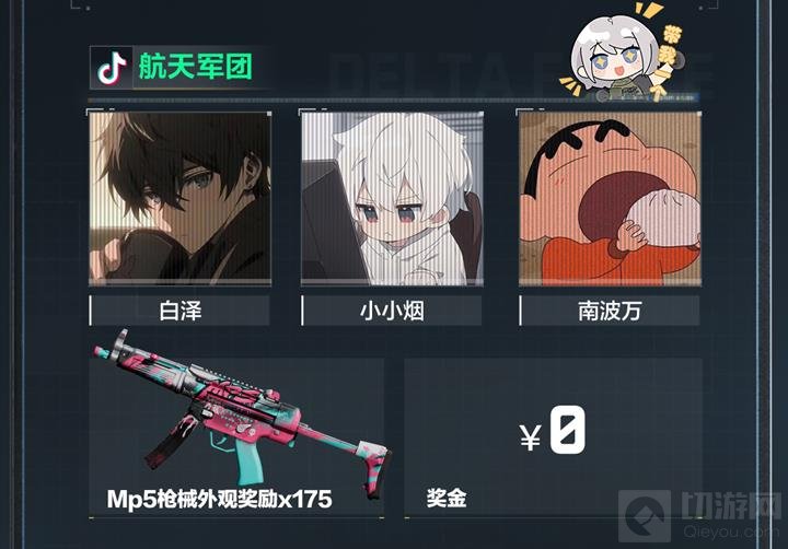 队员为白泽、小小烟、南波万,获得MP5枪械外观奖励 * 175。
