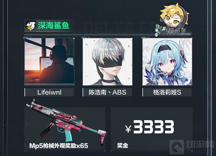 队员为“Lifeiwnl”、“陈浩南、ABS”、“格洛莉娅S”,获得MP5枪械外观奖励 * 65,以及3333人民币的奖金。