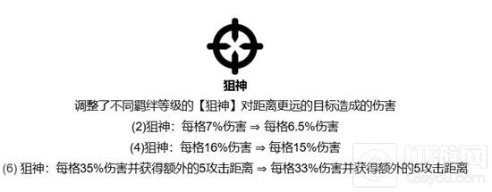 (6)狙神:每格35%伤害并获得额外的5攻击距离⇒每格33%伤害并获得额外的5攻击距离