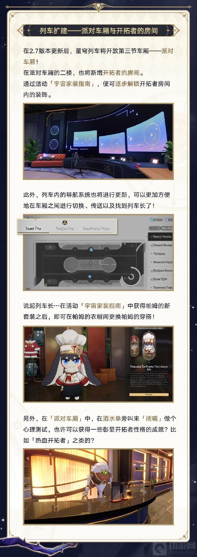 随着2.7版本的到来,列车将开放第三节车厢——派对车厢。在这里,开拓者可以尽情享受派对的乐趣,并且二楼还将新增开拓者的专属房间。通过参与活动“宇宙家装指南”,开拓者可以逐步解锁并装饰自己的房间,打造独一无二的空间。
