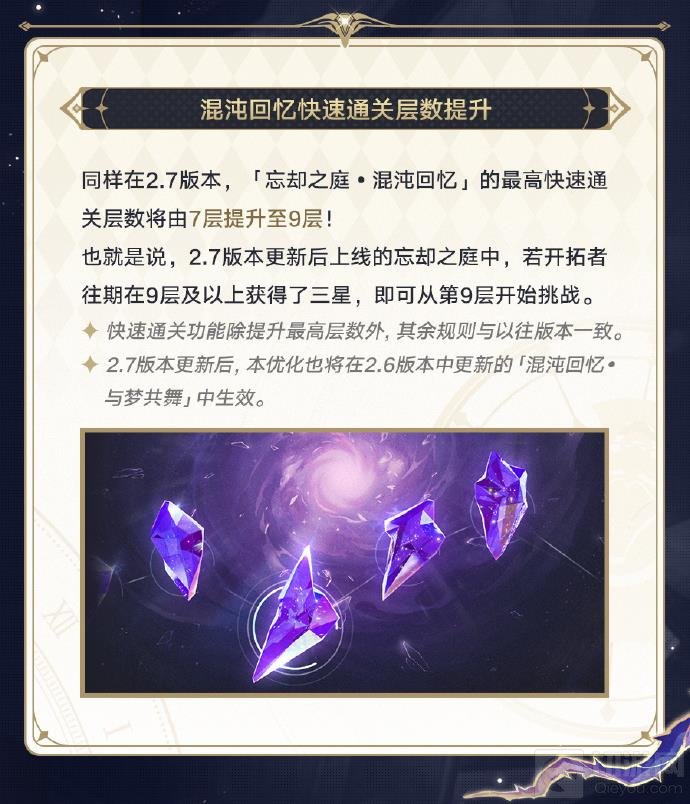为了满足开拓者们的挑战需求,2.7版本将混沌回忆的最高快速通关层数由7层提升至9层。这意味着,在新版本中,若开拓者往期在9层及以上获得了三星评价,即可从第9层开始挑战。快速通关功能除提升最高层数外,其余规则与以往版本一致。