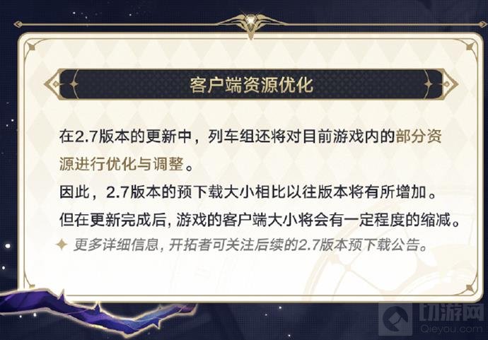 在2.7版本的更新中,列车组还对目前游戏内的部分资源进行了优化与调整。因此,2.7版本的预下载大小相比以往版本将有所增加。但在更新完成后,游戏的客户端大小将会有一定程度的缩减。更多详细信息,请关注后续的2.7版本预下载公告。