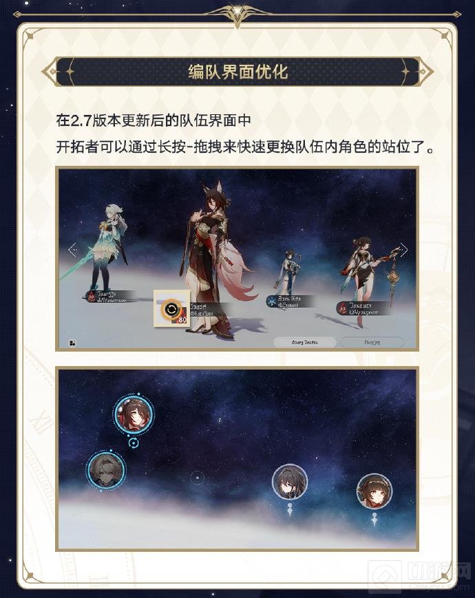 为了提升编队操作的便利性,2.7版本更新后的队伍界面中,开拓者可以通过长按-拖拽来快速更换队伍内角色的站位。