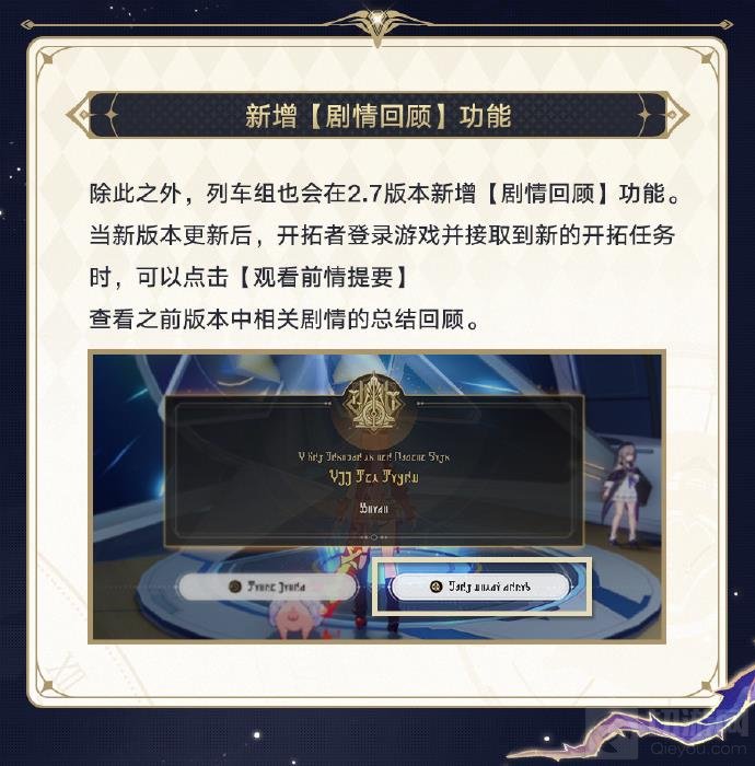 当新版本更新后,开拓者登录游戏并接取到新的开拓任务时,可以点击【观看前情提要】查看之前版本中相关剧情的总结回顾。