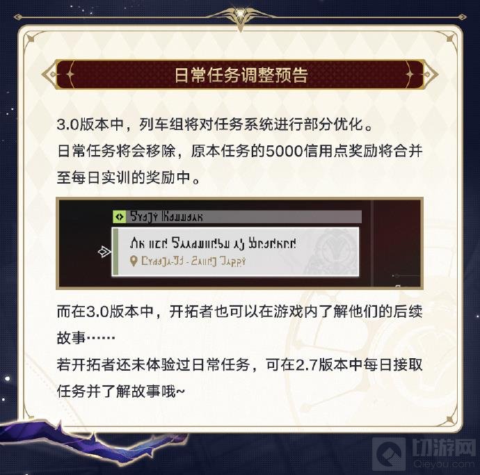 3.0版本中,列车组将对任务系统进行部分优化。日常任务将会移除,原本任务的5000信用点奖励将合并至每日实训的奖励中。而在3.0版本中,开拓者也可以在游戏中了解他们的后续故事。