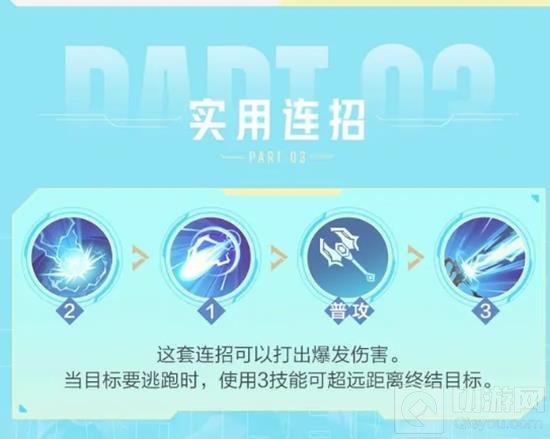 这套连招可以打出爆发伤害,当目标逃跑时,使用三技能可超远距离终结目标。