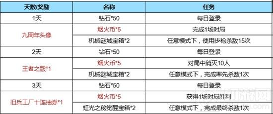 此次活动的任务每天都会刷新,前三天的任务是任意模式下、使用步枪杀敌15次、对局中消灭10人,完成指定的杀敌即可,由于是任意模式自由度比较,玩家都能轻松完成。前三天的大奖是九周年头像、王者之骰*1、工厂十连抽券*1,还能领取机械飞升宝箱*4、虹光之秘觉醒宝箱*2、烟火币*15以及钻石*150。可以说每天的奖励都相当的丰厚。
