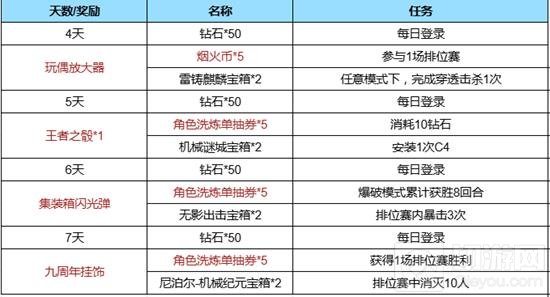 后面四天的任务有的是需要排位赛内完成,玩家可以直接参与排位赛团队战,这样能够快速完成任务,至于爆破模式累计获胜8回合也是很简单的,基本上玩2局爆破模式就搞定啦。当然大奖依然给力,不仅有玩偶放大器、王者之骰*1、集装箱闪光弹还有九周年挂饰。每一个大奖单独拿出来都是非常受欢迎的。玩偶放大器之前没获取的玩家,这次可不要错过啦。