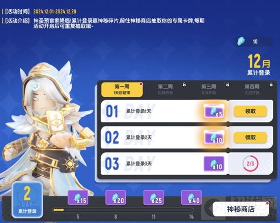 内容:玩家每周累计登录可以获得神秘碎片,用于在神秘商店兑换专属奖励。