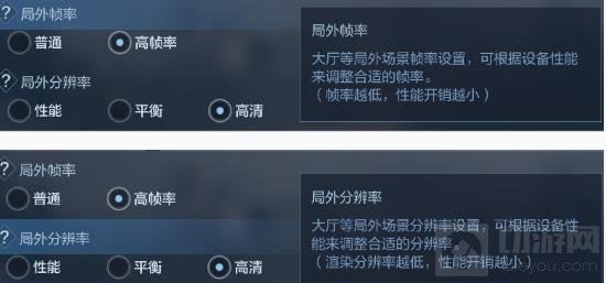 目前,局外帧率开放【普通】【高帧率】两档,局外分辨率开放【性能】【平衡】【高清】三档供大家调整,后续将视情况将开放更多选项,敬请期待。
