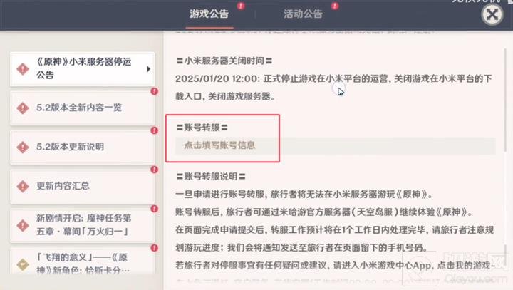 登录《原神》官方App,在公告中找到“账号转服”选项,点击“点击填写账号信息”;
