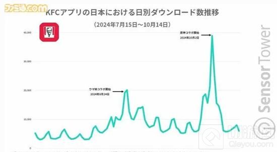 根据Sensor Tower数据,2024年7月15日至10月14日期间,肯德基官方App在日本的日下载量在《赛马娘Pretty Derby》上线当天与第二天大幅上涨。