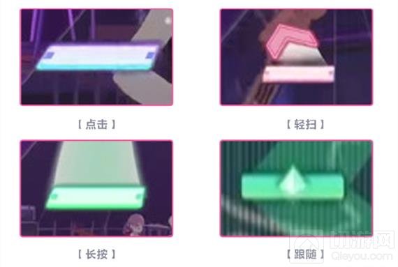 在游戏中共有四类音符,分别是点按、长按、轻扫、跟随。
