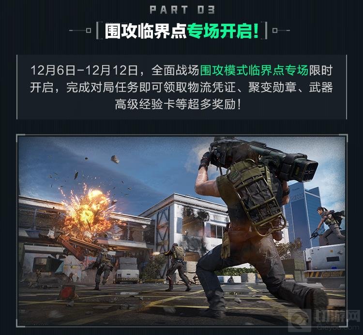 - 全面战场“围攻模式”特别开放限时临界点专场。完成特定对局任务,即可获得物流凭证、聚变勋章、武器高级经验卡等丰富奖励。