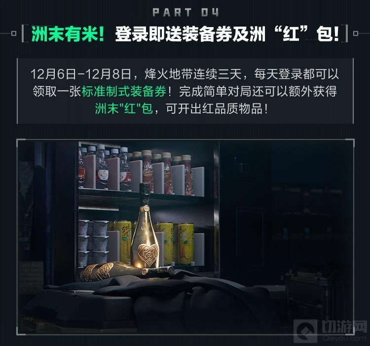 - 烽火地带福利来袭,连续三天登录即可领取标准式装备券;完成对局任务还能获得周末“红”包,内含随机红品质物品。