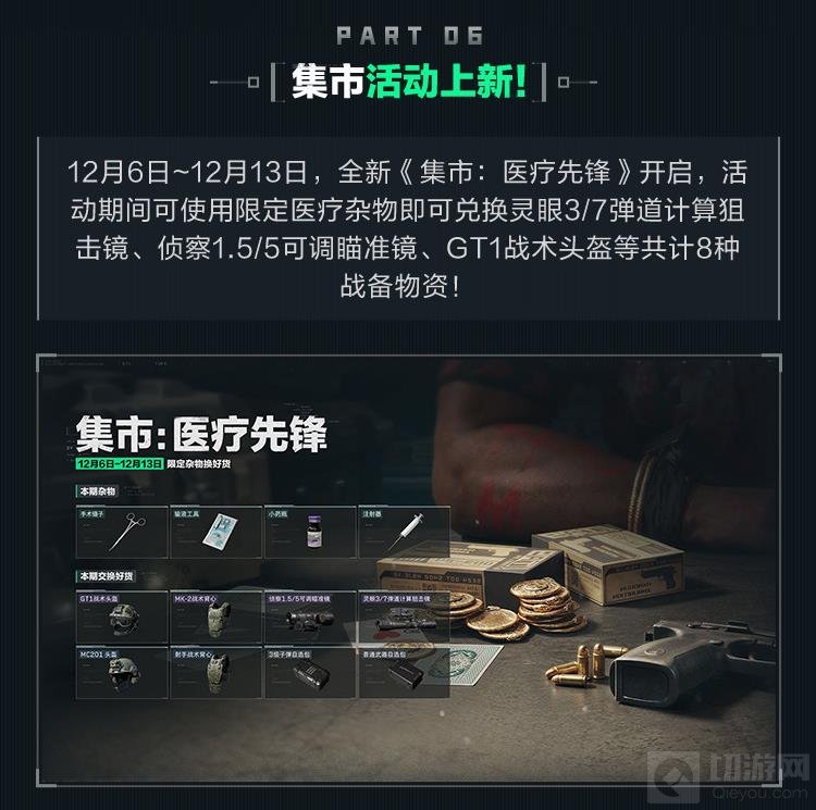 - 限时开启“医疗先锋”集市,各位干员可使用活动获取的医疗杂物兑换8种战备物资,包括灵眼3/7弹道计算狙击镜、侦察1.5/5可调瞄准镜、G11战术头盔等。