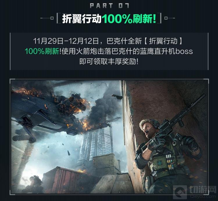 - 巴克什的“折翼行动”100%刷新,各位干员可使用火箭炮击落蓝翼直升机Boss,收获丰厚奖励。