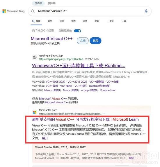 下载最新版本: 在搜索结果中选择“最新的受支持的Visual C++可再发行软件包”,这将引导你到一个页面,其中列出了不同版本的C++可再发行程序包。