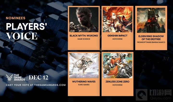 2024年游戏界盛典“游戏大奖”(TGA)的“玩家之声”奖项第三轮投票现已开启,五款入围游戏正式揭晓,分别是:《黑神话:悟空》《原神》《鸣潮》《绝区零》和《艾尔登法环:黄金树幽影》。这些游戏均在过去一年展现出超凡的制作水准和广泛的玩家影响力,将在本轮中一较高下。