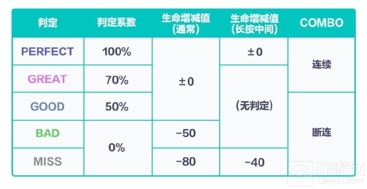 判定分为 PERFECT、GREAT、GOOD、BAD 四个等级,如果未获得任何判定等级,则会显示 MISS,如果获得了 GOOD、BAD 或 MISS 判定,COMBO 就会断开。