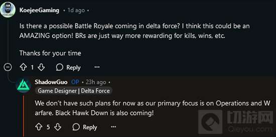 郭智在回答玩家提问时迅速否定了游戏将推出大逃杀模式的可能性。他解释说:“我们目前没有这样的计划,因为我们的主要关注点在于作战和战争。”他进一步指出,玩家应该期待即将推出的“黑鹰坠落”剧情战役模式。