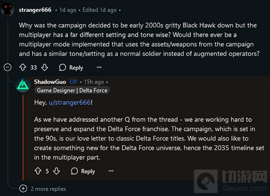 在回答另一个问题时,郭智讨论了该战役的背景和主题背后的灵感,强调它与多人模式的设定有所不同,并表达了希望通过这个战役向以往的《三角洲》游戏致敬的愿望。