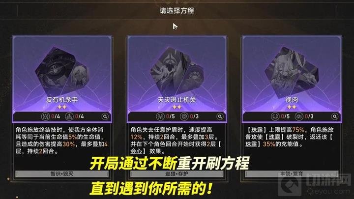 如果你的基本角色全图鉴已解锁,可以考虑开局随意选择一个方程入局,根据情况调整配队。但我的建议是,一开始就确定你想玩的体系,无限重开直到刷到你需要的2星方程再开始游戏!