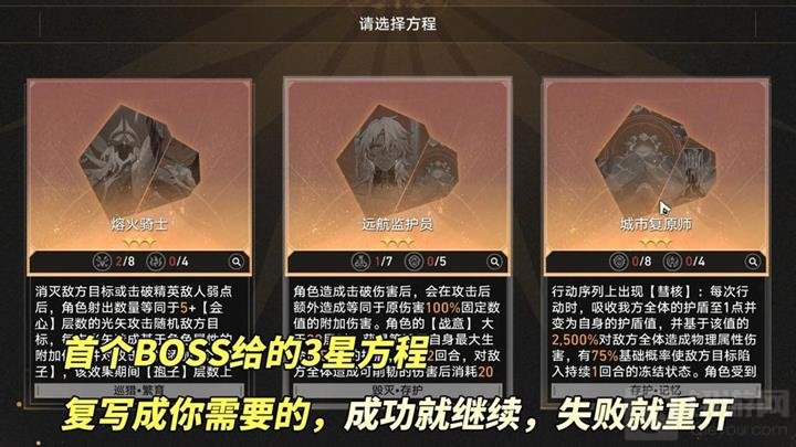 首次BOSS战是决定是否重开或继续游戏的关键时刻!战斗结束后,如果获得的3星方程不是你预想的体系,就通过调试台复写方程,直到刷出体系关键方程。如果碎片用完还没出现,那就直接重开,不要挣扎。(优势体系已在九个3星方程机制中明确,按照某个体系玩,通关难度会更低)