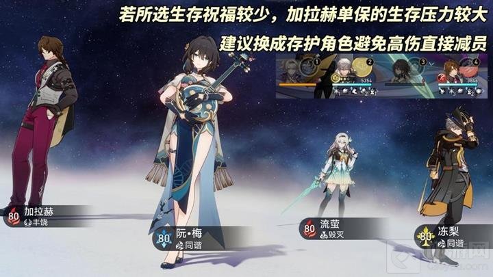 推荐祝福除了激活方程必备外,还可以选择以下机制:弱点击破效率、额外超击破伤害、穿透、减防、击破再动、击杀再动、生存相关祝福。配队推荐:流萤+同谐开拓者+加拉赫+阮梅。如果你在游戏中途选择的生存相关祝福较少,且未获得伤害分摊,加拉赫单保的翻车率较高,不如换成一些存护角色。