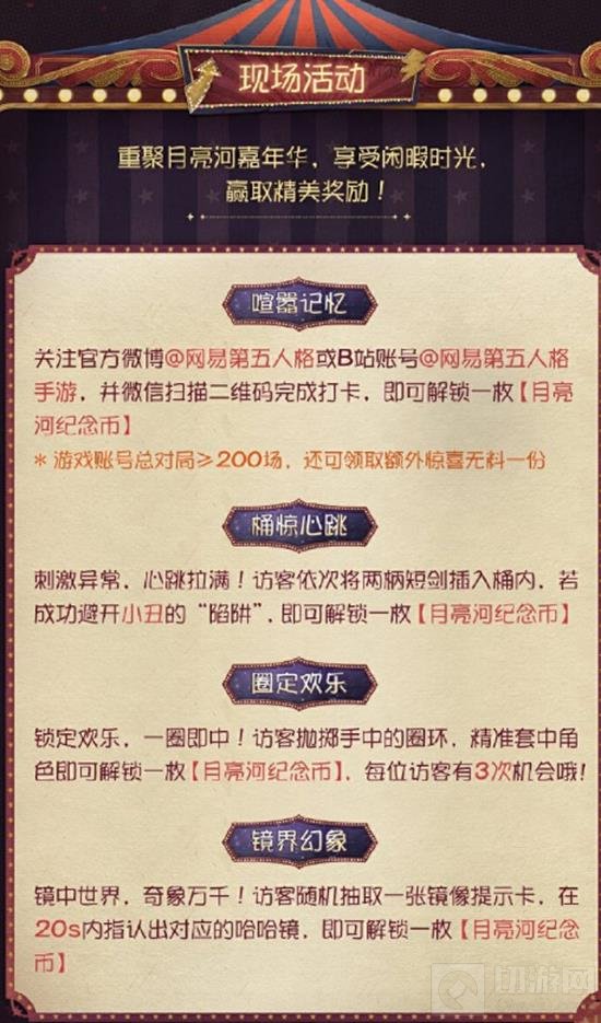 关注官方微博 网易第五人格或B站账号 网易第五人格手游,并微信扫描二维码完成打卡,即可解锁一枚【月亮河纪念币】。