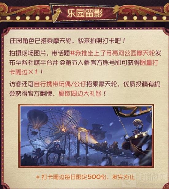 庄园角色已搭乘摩天轮,快来拍照打卡吧!拍摄现场图片,带话题#我推坐上了月亮河公园摩天轮发布至各社媒平台并 第五人格官方账号即可获得限量打卡周边x1。